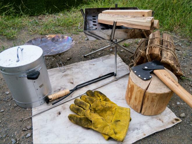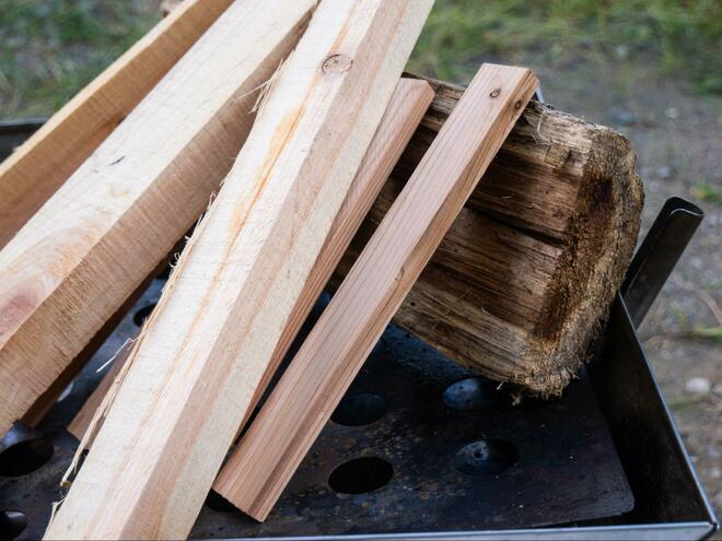 薪の種類は「針葉樹」と「広葉樹」の2種類に大きく分けられる。針葉樹は燃えやすいので火おこし用、広葉樹は一度火がつくと長持ちするので調理や団らんに、と覚えておくとよいだろう。購入する際は乾燥した薪を選ぶことが重要だ。キャンプ場やホームセンターで購入することができる。