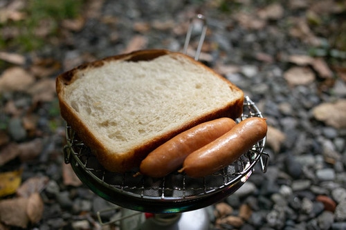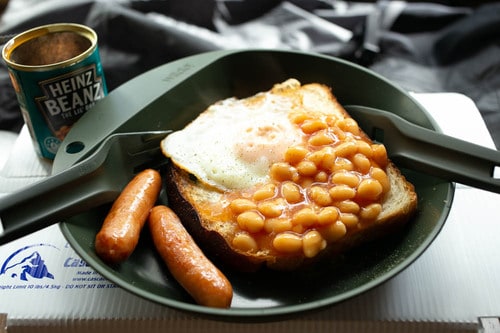 かくのごとし。主役はよく焼いたトーストに有塩バターをたっぷり塗り、ベイクドビーンズをのせた「ビーンズ・オン・トースト」と呼ばれるメニューだ。さらに目玉焼きものせ、ソーセージを添えれば、山でも作れるフル・ブレックファストの缶成であります。トースト1枚につき1缶の約半量をのせると、味的にもボリューム的にもちょうどいいと思う。
