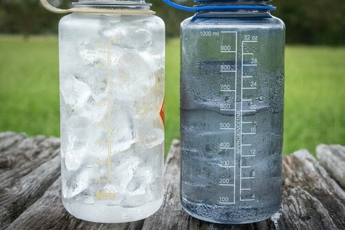 用意したのはサーモシェルと2本のナルゲン、そしてコンビニのロックアイスです。ナルゲンに氷をなるべく均等になるよう入れていきますが、準備をしている間にも解けはじめていくので焦ります。