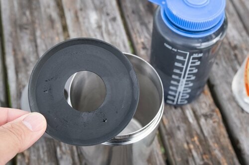 サーモシェルの使い方は簡単。まず底にガタツキ防止のボトムシートをセットし、ナルゲンをインサートしてスクリューキャップをしめるだけ。