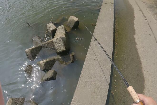 自分が立っている護岸の壁際(ヘチ)や消波ブロックのすき間など足元近くに仕掛けを投入すればOK。むやみに川の沖合へ投げると根掛かりする確率が高くなるため、初心者は避けた方がよい。