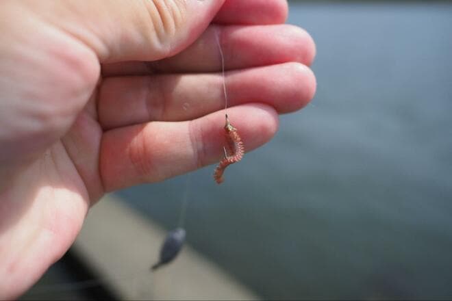 涸沼川のハゼ釣りは特別な道具を必要とせず、誰でも気軽に挑戦できるのが魅力。基本は、チョイ投げ用のリール竿か、長さ2〜3m前後のノベ竿があれば十分だ。仕掛けはハリ・ヨリモドシ・オモリだけのシンプルな「ミャク釣り」仕掛けが適しており、エサには虫エサのアオイソメやジャリメを用いる。ハゼは川底にいるので、エサを必ず底に届かせることが重要である。