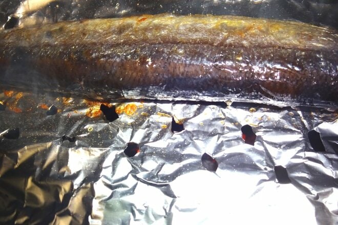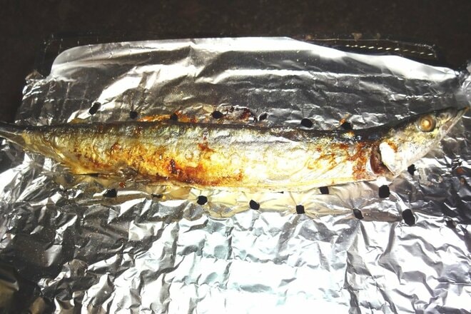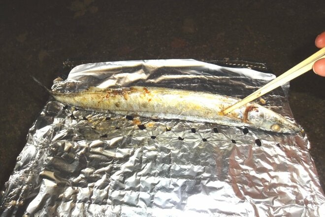 サンマの皮が剥がれず、フライパン用アルミホイルに穴をあけたおかげで、おいしそうな焼き目と炭火焼き特有の香ばしい香りが広がった。網でくっつかないように焼くには時間と手間がかかり、鉄板焼きの要領でアルミホイルで焼こうとすれば、遠赤外線が遮断されて火が通りにくくなり、焼き目がつかない。