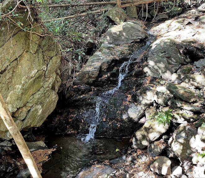 小田休憩所から歩き始めると、すぐに緑のトンネルが出迎えてくれる。道は沢沿いに続き、石橋や木橋を渡りながら進む。せせらぎの音が心地よく、登山のリズムを刻んでくれる。