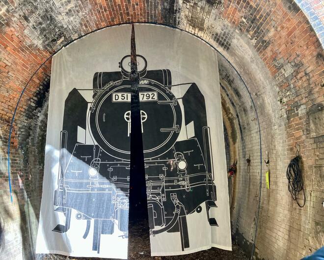 3号トンネル入口には、実物大のSLの大幕が掛かっている。内部に入り暗いトンネルを抜ける際、光の向こうに紅葉が見えてきて、なんとも幻想的である。