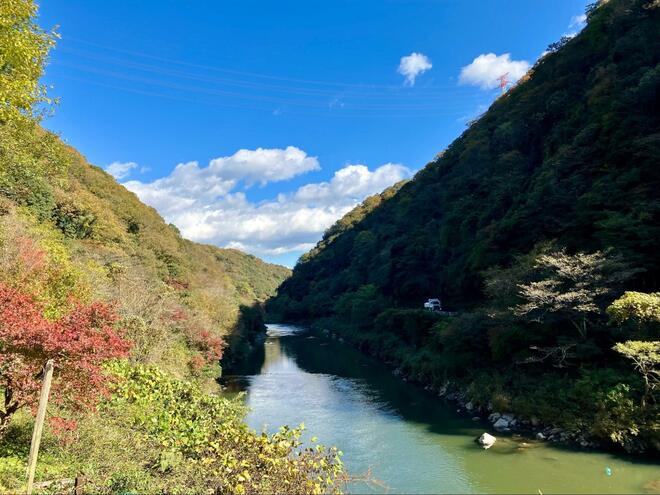 小休憩を挟み、スタート地点に戻ってきた。見事な赤レンガのトンネル群と、グラデーションに色づくモミジ、眼下に望む渓谷。名古屋駅からたった30分の場所とは思えない、自然豊かで見応えのある紅葉スポットだった。