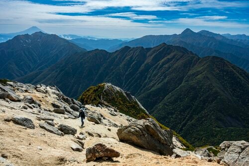 立体的な山容、そそり立つ岸壁。「摩利支天(まりしてん)」とあわせて花崗岩の白さが際立つ標高2,967mの甲斐駒ヶ岳。その端正な姿から“南アルプスの貴公子”とも呼ばれているそう。山頂部は高度感ある登山となります。