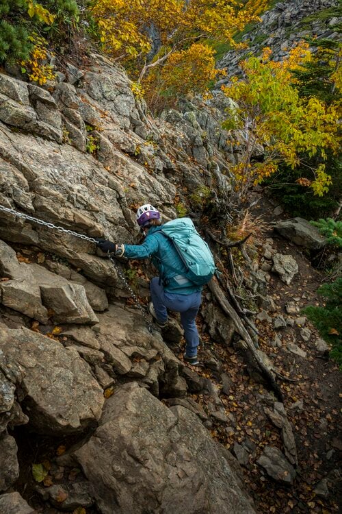 六合目「駒津峰」から先は岩場が次々と登場します。「六方石(ろっぽういし)」を経て、直登ルートへの分岐がありますが、こちらは“破線ルート”となっています。岩稜に慣れた人のみ。岩の難易度も然ることながら、ルートファインディングの難易度も上がります。