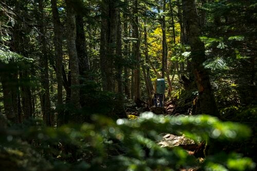 出発前、朝4時に小屋前から空を見上げると、シラビソの合間から星が煌めいています。気温は4.7℃。好天を期待しながら、かろうじてヘッドランプがいらない明るさのなかを歩き出しました。長衛小屋の脇から沢沿いに上がり、神秘的な雰囲気の森のなか「仙水小屋」から「仙水峠」を目指します。