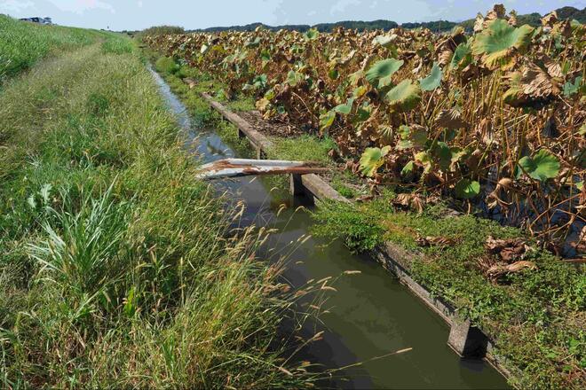 秋になるとイネ田では稲刈りが始まり、田んぼの水が落とされるため、周囲のホソも干上がってしまう場所が少なくない。これに対して、ハス田はほぼ一年を通じて水を張ったまま管理されるため、脇を流れるホソにも水があり、小ブナたちが潜んでいる。