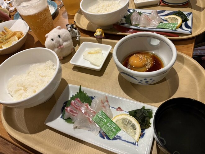 荷物を置いてレストランで晩ごはんを食べる。21時頃だったが、レストランは大盛況。好きな小鉢を選びながら最後にメインメニューを注文する形式。筆者がメインで頼んだのはオレンジフェリーの看板メニュー「宇和島鯛めし(1,700円)」。