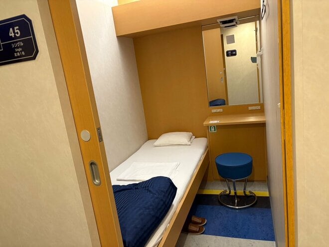 少し狭めの部屋だったが、秘密基地のようなワクワク感があり、逆によかった。注意点もある。まず、外鍵がかけられない点。貴重品は必ず持ち歩こう。また、タオルや歯ブラシなどのアメニティセットがないため、準備をしておこう。もし忘れてしまった場合でも、船内の自動販売機で購入できるため安心。