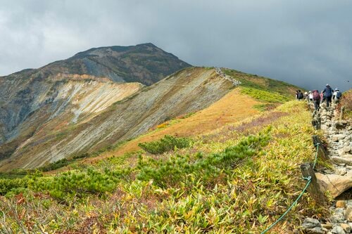 ちょうど紅葉が見頃を迎え、赤や黄色に山肌を彩っています。今年は山の紅葉がとくに美しい当たり年。通常、往復3時間程度のルートですが、八方池へ向かう人の列は山上でも続いており、スローペースで進んでいきます。ゆっくり歩く分、辺りの紅葉をのんびりと眺めながらのトレッキングが楽しめました。