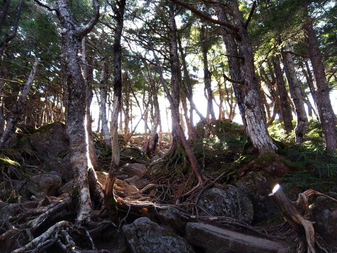 白駒池の湖畔から、にゅう方面を指す看板を頼りに分岐を進む。ここからは本格的な山道に入り、徐々に傾斜も増していく。あちこちに木の根が張り出した登山道は滑りやすい場所もあるので、足元の苔に目を奪われてスリップしてしまうことのないよう慎重に進もう。しっかりと整備がされているので、気を付けて歩けば問題なく進めるコースだ。
