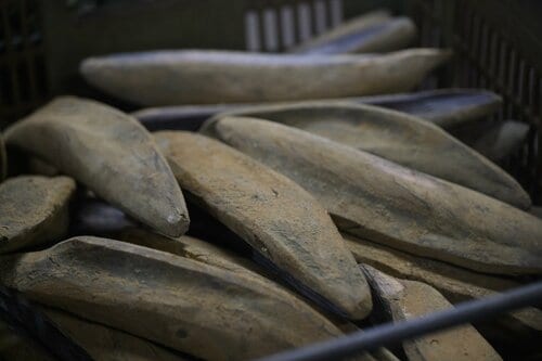 その後、燻す工程を経たものが「荒節」というもので、ここまでできあがるのに1か月かかるという。この状態でも削って出汁として使用することもできるが、表面を削って形を整えたのが「裸節」というもの。これに麹菌のカビを付け、湿度の高い場所での保管と、天日干しを3、4回繰り返すことで、カチコチの硬い「本枯れ節」ができあがる。