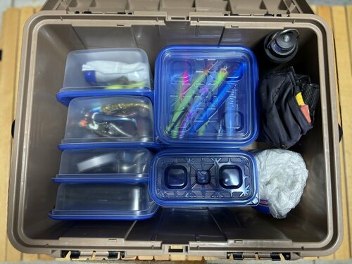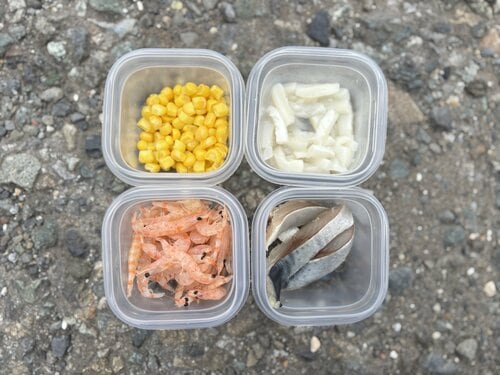 エサの持ち運びにはコンテナーがおすすめ。アミノ酸やニンニク漬けなど、エサの漬け置きも可能。