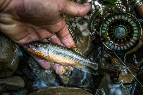 わずかなライズもありますし、その後も流れるフライに水面が幾度も割れました。なかなかフッキングしないので、小さいアマゴばかりなのだろうと思っていました。そこでフライを少しサイズダウンしてみると……。釣れました! あれ? ハヤです。一瞬ウグイかと思ったのですが、よく見るとカワムツのようです。