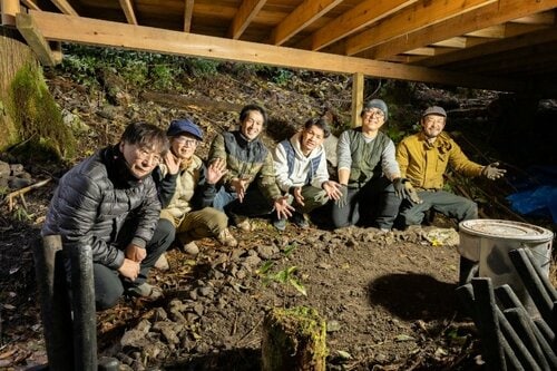 何をするにも大変な作業になるTHE WATERSの現場。でもそこにはいつも笑顔と充実感がある。完成したこの土台の上に熱源を据えて(まずは簡易かまどで)、上のテラスへと湯気を送り込む準備が整った。