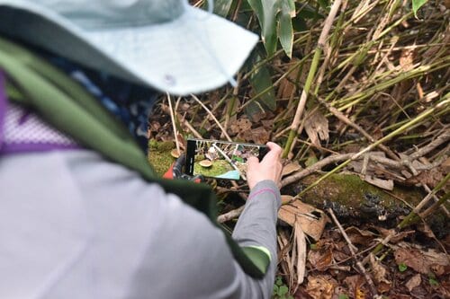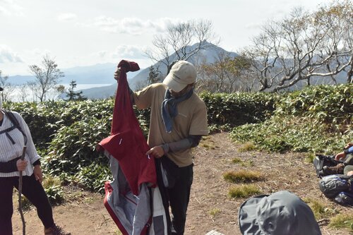 山頂では休憩時間を使って、レインジャケットに関するレクチャーもありました。ツアーに同行していたコロンビアスポーツウェアジャパンの衛藤智氏から、薄手で軽く、持ち歩きにも便利な2.75レイヤーのレインジャケットと防水透湿機能を備えた3レイヤーのレインジャケットの違いや用途について説明があり、参加者も熱心に耳を傾けていました。