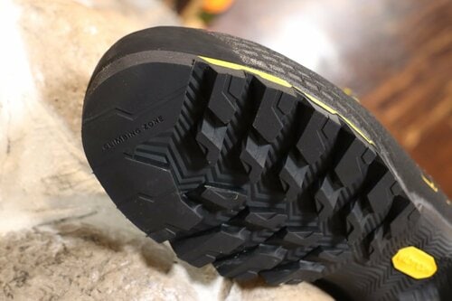 さらに、つま先部分には「クライミングゾーン」というのがあって、岩場で体重をかけやすくて踏ん張りやすいように、ちょっと広めにフラットになっています。