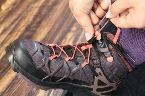使い方は、まず、黒いひもを普通のシューズと同様にフックにかけて締めます。次に、ピンクのひもを引っ張って甲をフィットさせ、最後にキュッと絞るように締めればOK。ひもの長さが余ったら、引っ掛けると危ないので、中央にある黒いゴムに挟んでおきましょう。