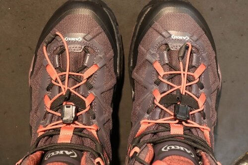 「ロケットミッド DFS GTX」はハイキングモデルで、低山向けのミッドカットタイプです。一番のユニークポイントは、シューレース(靴ひも)にあります。