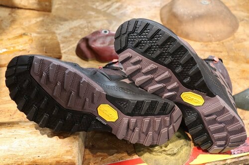 もうひとつ特徴的なのがアウトソールで、「ビブラム・トラクションラグ」という新しい機能を搭載したソールが使われています。写真を見ると、ソールが2色に分けられているのがわかります。