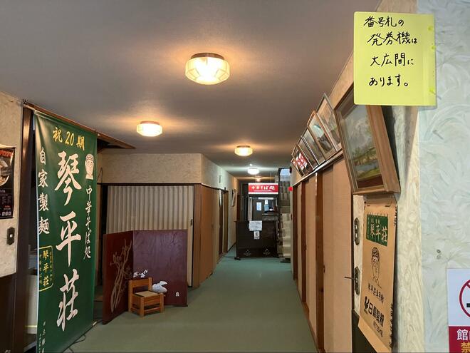 店構えは旅館の建物がそのまま活かされ、大広間(宴会場)が客席となっている。発券機から整理券を取り順番を待つシステムだ。2〜3時間の待ち時間となることもザラにあるので、開店前の朝8時〜10時に整理券を取っておき、周辺を観光して昼時にお店に戻ってくると時間を有効に使える。