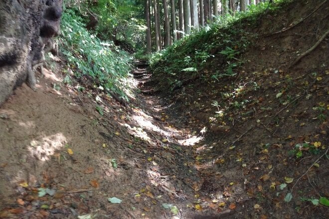 市街地から離れた場所にあり、釜石自動車道・遠野ICからは約8分、駐車場から約300mほどの狭く急な山道を、クマ出没の看板に注意しながら20分ほど登ることとなる。クマ鈴をつけたり、事前にクマ出没情報を確認するなど十分注意してほしい。