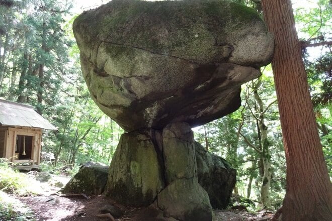 見れば見るほど異様な巨石であるが、この笠石は土台となる2つの岩のうち片側にはのっておらず、わずかに浮いている。絶妙にして微妙なバランスでのっているのだ。不安定に見えるが、何度も大きな地震があっても崩れたり落ちたりしなかったので、古代の人々が何かのご利益を期待したのも頷ける。土台の岩の間をすり抜けると祈願成就するとか。主なご利益は開運・運気上昇、厄除け、邪気払いなど。
