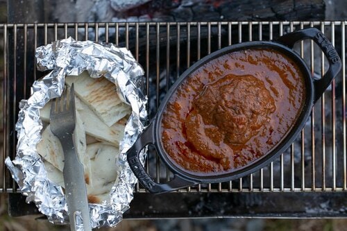 かくのごとし。カレーはクッカーに中身を移して温めるだけで十分。付け合わせに持ってきたナンは、アルミホイルに包んで熾火の上に置き、温かい状態を保っておいた。こうして簡素な食卓を整えると、まるで自分がハンターになり、仕留めた鹿を食しているような気がしてきた。もちろん妄想なんだけど。