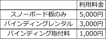 プレミアムレンタルの料金は、スノーボード板のみが5,000円、バインディングレンタルが3,000円、バインディング取付料が1,000円となっています。