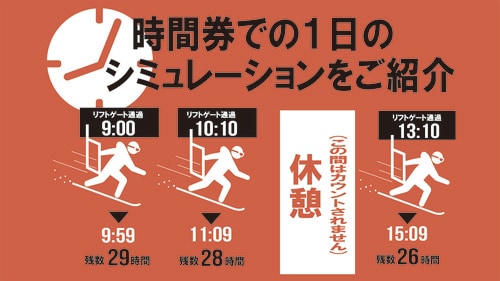 スノーボード天国内特設サイトでは「25+5時間 30時間券」を11月30日まで限定販売しています。通常25時間券のところを早割特典で5時間サービスし、30時間券として3万円で販売されています。1時間単位で利用でき、シーズン中であれば繰り越して利用可能です。