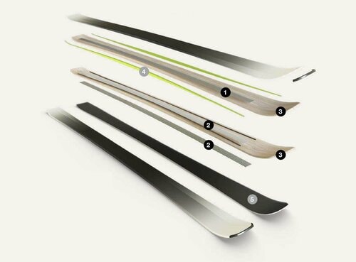 現在、エランスキーの根幹を成すテクノロジーが左右非対称構造のアンフィビオテクノロジー。 スキーの外側がロッカー構造、内側がキャンバー構造というエランが独自に開発した他のブランドにはないスキーテクノロジー。