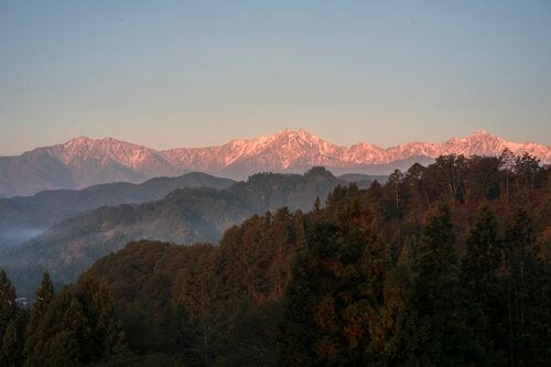 北アルプスが初冠雪した朝、移動の途中に高速道路から見た山並みはモルゲンロート(※)に赤く輝き、つい見惚れてしまいます。しかし、仕事に向かう道中でしたので、ゆっくり撮影をしている時間がありませんでした。