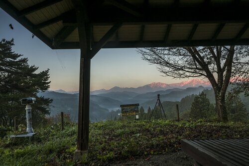 その翌日、ゆっくりと朝日に輝く山並みを撮りたくて夜明け前に出発して展望スポットへ向かいました。訪れたのは長野県小川村の山中、標高630mにある「柏土展望広場」です。ここからは鹿島槍ヶ岳や爺ヶ岳を中心に北アルプス北部の山々を眺めることができます。