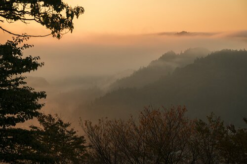 東側に目を向けると、小川村の谷間には朝霧が立ち込め、幾重にも重なる里山の稜線はベールに包まれています。朝焼けで赤が滲むような雲海が広がっており、幻想的なシーンを見せていました。