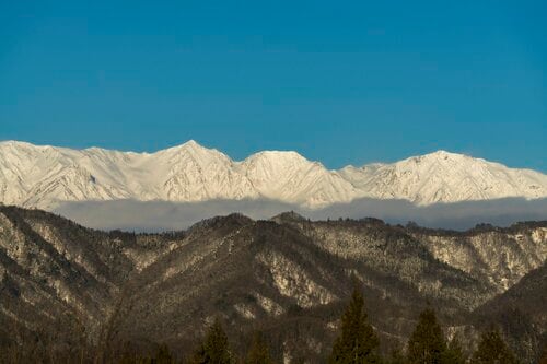 柏土展望広場からも近い、同じく小川村の標高851mの地点にある「アルプス展望デッキ」。ちょうど良い距離感で北アルプス・後立山連峰が見渡せる絶景スポットとして人気のスポットです。県道36号線「小川アルプスライン」の道路脇にあるので、冬でも車で来ることができるのです。