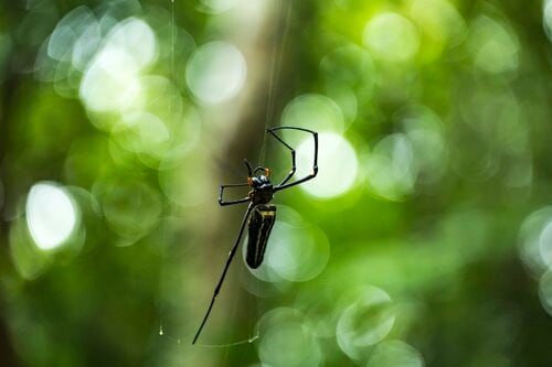 気温は26.8℃。小雨が降ったり止んだりの天気。鬱蒼と茂る森の木々に遮られて雨具がいらないくらいでしたが、あまりの湿気にカメラのレンズが曇ります。見慣れない植生が興味深くキョロキョロしていると、散策路を塞ぐようにオオジョロウグモが大きな巣を張っていました。日本で最大の大きさと言われるだけあって、なかなかの貫禄です。