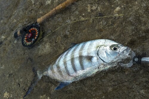 そのときはいきなりやって来ました! フライが着水したと同時に、引ったくられるようなアタリ、そしてダッシュ! サイズこそ大きくないですが、広い海原を走る魚に大興奮でリールファイトです。テールキャッチしたのは、南国ムード満点のクロヒラアジでした。