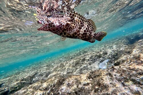 ポイントを移動して外海が近い岩礁帯へ。ここは今回で一番魚影が濃く、小さなトロピカルフィッシュに混ざって、釣りの対象になりそうなサイズの魚が多くいます。オオモンガラの反応が良く、フライを流すとすぐに飛びついてきました。しかしさすが根魚、フライを咥えたまま無数に空いた穴へと逃げ込まれます。小さいものはすぐに引き寄せられますが、少しサイズが大きくなると根掛かりと変わらないような状態に陥ります。最後は浅いのをいいことに回り込んで、逃げ込んだ穴からラインを手繰って引っ張り出して無事にキャッチしました……。