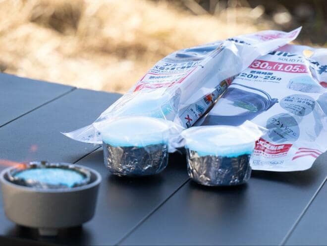 キャンプ初心者からベテランまで人気のDAISO(以下、ダイソー)の固形燃料。100円ショップのキャンプ用品の中でも定番ギアとして知られ、メスティン炊飯や簡単な煮込み料理など、調理目的で使う人が多い。