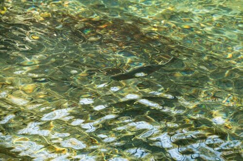フックサイズの小さな(#20前後)コカゲロウを模したフライをいくつか試しますが、色の濃い大型のニジマスたちは微動だにしません。まるでホログラムかプロジェクションマッピングのよう。ガガンボが岸際でふらふら飛んでいたのを思い出し、少し大きめのガガンボパターンを流してみますが、頭上を流れるフライに見向きもせず無視されてしまいました。