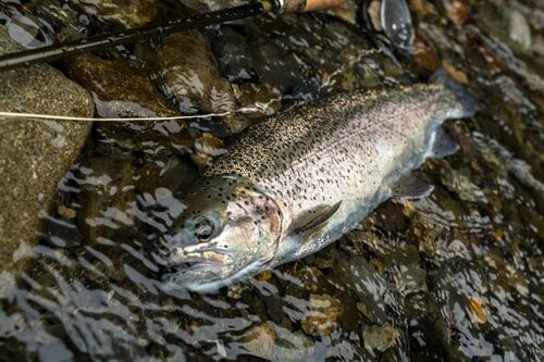 大型のニジマス(美ハコ)を諦めて、銀色の小さめのハコスチにターゲットを変更しました。緩やかな流れに沿うように水面を気にしている魚を狙ってフライを流すと、すっと浮上しては身を翻して定位位置に戻っていきます。ときおりライズもあるので、ターゲットを見つけては少しずつ上流へと釣り上がっていくと、いきなり水面が割れました! すかさず合わせると、確かな手応えとともに銀色のニジマスが宙を舞います。