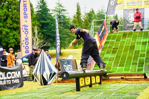 SNOWSLAMは10月18日の予選「AMA SESSION」、19日の決勝「PRO SESSION」という2日間構成。特設会場に設置されたレールアイテムは、アプローチも着地も人工芝が敷かれています。雪上とは全く異なるこのコンディションは、難易度が格段に上がります。スピードコントロールも着地の感覚も雪とは違うため、ライダーたちにとっては挑戦的な舞台です。