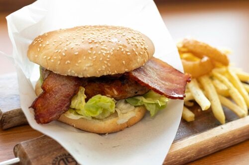 スキー場の上部だけで午前中を満喫し、お昼はゴンドラ山頂駅内にある「スカイレストランZEN」でハンバーガーをいただく。