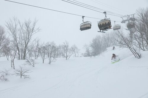 ゴンドラとリフトを乗り継いで山頂に到着したら、まずはその直下に広がる船石エリアに飛び込む。ここはボウル状になった地形で斜面の見通しも良いので滑りやすい。雪質は踏むと程よい抵抗が足元から返ってくる柔軟なパウダー。踏んでも底付きしないのでふわふわと浮くようなパウダーの醍醐味を感じられる。