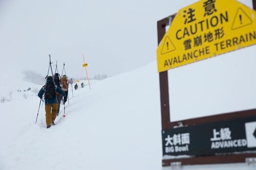 午後はアライの名物「大斜面」へ向かう。大斜面は山頂リフトを降りてさらに上へと歩いて登って滑る。登る時間は20分ほど。新雪の上を歩く場合はスノーシューなどの専門のギアが必要だが、多くの人が歩いた後なら道が踏み固められていてブーツのままでも歩ける。