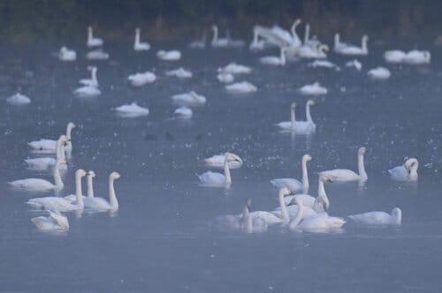 間もなく日の出となる6時前。池に到着すると、池に白い霧が立ち込め、幻想的な風景を作り出していました。早起きのコハクチョウは「コー、コー」とよく響く声で鳴きかわしています。訪れた時には、上池・下池を合わせ4,000羽を超えるコハクチョウが浮かんでいました。10月下旬から11月にかけてが、一番多くなる頃とのこと。夜の間、コハクチョウは安全な池で過ごします。また、遠くにゴマ粒のように見えるのはカモの仲間たち。20,000羽を超える大群です。