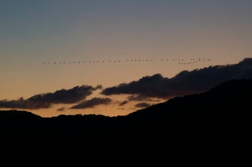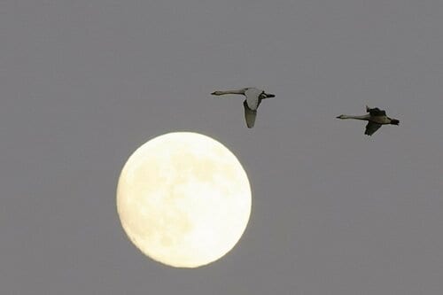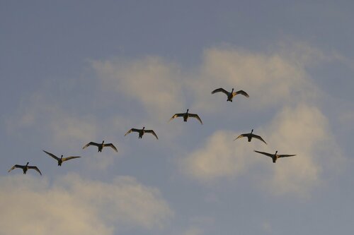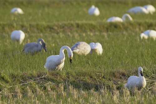 午後3時を過ぎると、少しずつコハクチョウが帰ってきます。帰宅時間は群れによって様々。日が沈むにはまだまだ余裕があるのに早々と帰ってくるのは優等生グループでしょうか。